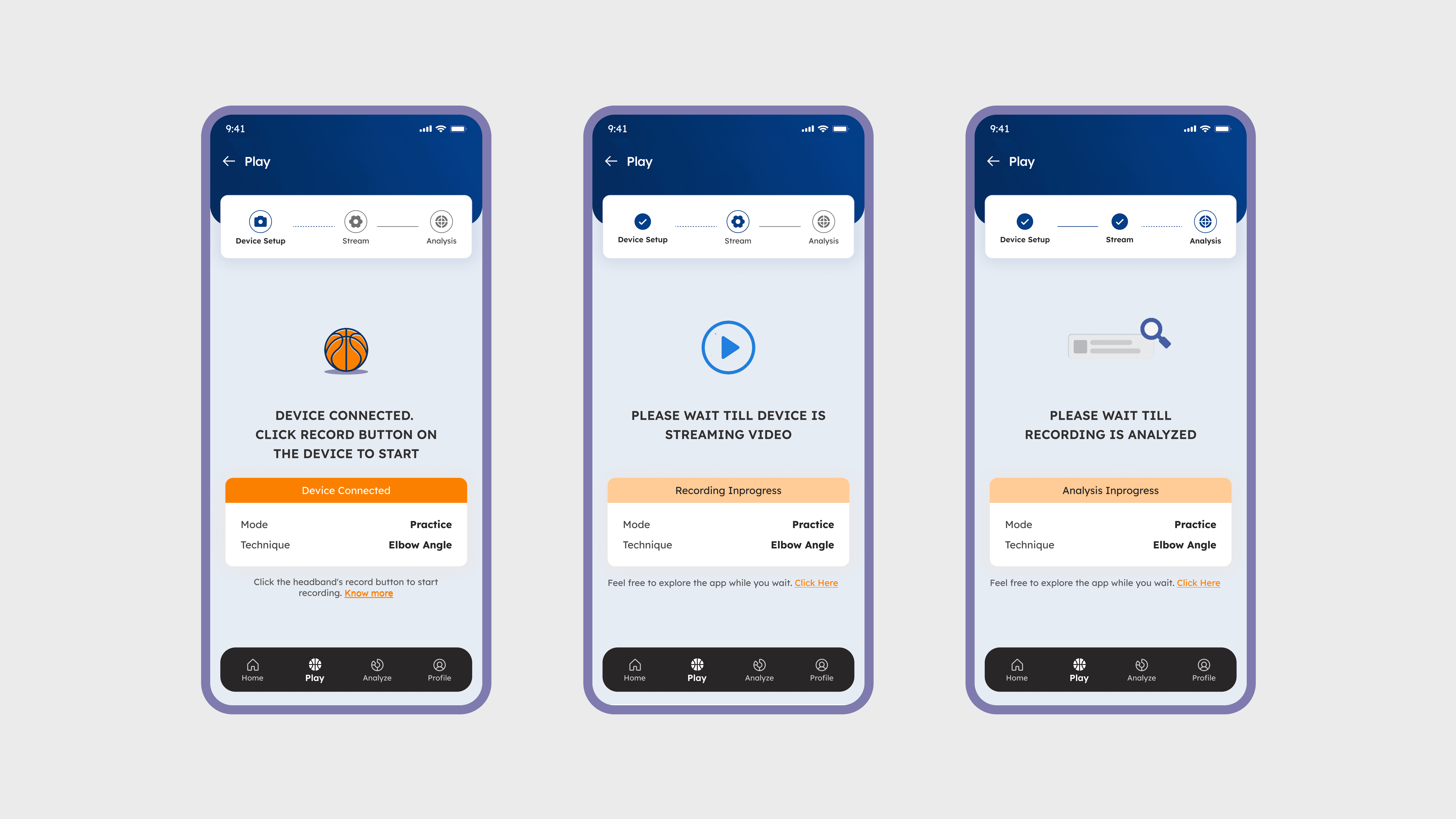 As we tested the system, we iterated on how the mobile app communicated device activity and long-running processes during practice sessions.