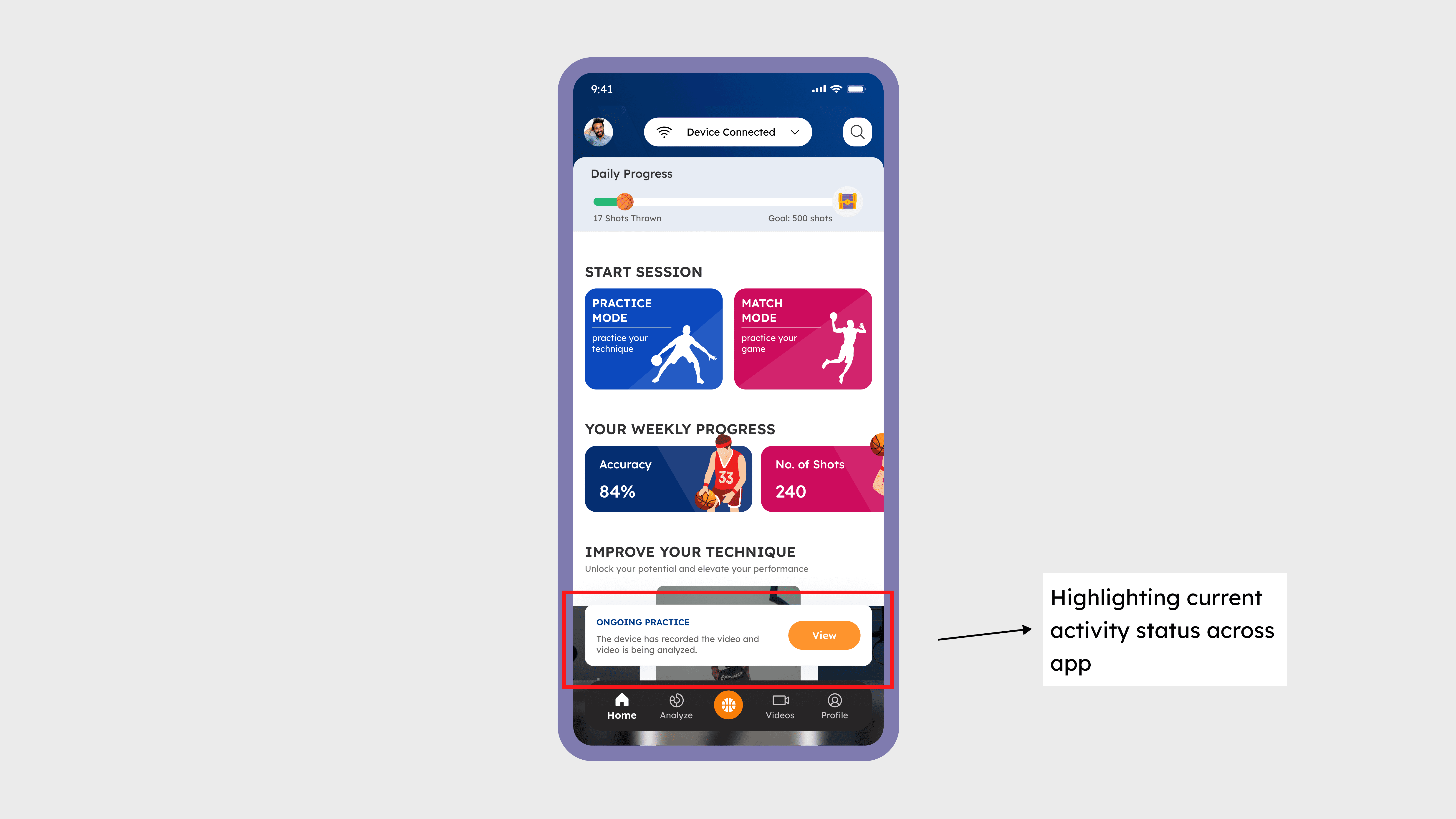 Persistent status indicators allowed players to track recording and AI analysis progress while continuing to explore the app.